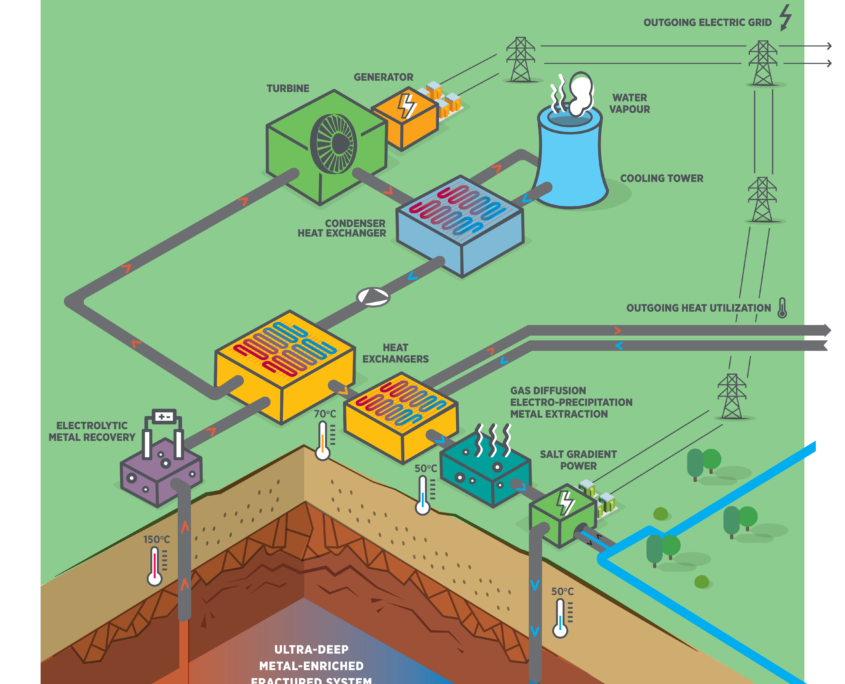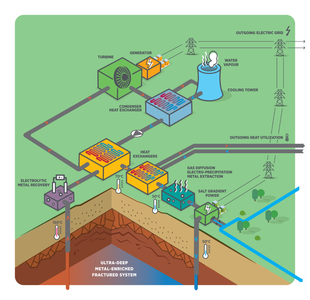 CHPM2030 developed a novel and potentially disruptive technology solution which can help satisfy EU member-states’ needs for energy and strategic metals in a single interlinked process. The project aimed at converting ultra-deep metallic mineral formations into orebody-EGS’ which served as a basis for the development of a new type of facility for Combined Heat, Power and Metal extraction (CHPM). The project defined a CHPM related methodology framework, and laboratory experiments aimed to investigate integrated reservoir management, metal mobilization using mild leaching and nano particles, overall system dynamics, metal recovery with geothermal fluid electrolysis and gas diffusion electroprecipitation and electrocrystallization, salinity gradient power. As a final outcome, the project delivered specifications of the new CHPM scheme. The horizontal aim was to investigate previously unexplored pathways at low technology-readiness levels. This has been achieved by developing a roadmap in support of the pilot implementation of a CHPM system before 2025, and full-scale commercial implementation before 2030.