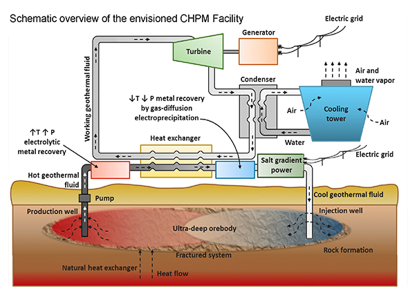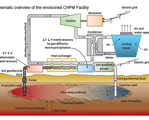 CHPM2030 a pour objectif de développer une nouvelle technologie qui permettra aux Etats Membres de l’Union européenne de subvenir à leurs besoins énergétiques et métalliques via un seul et même procédé. Le projet convertira les dépôts métalliques ultra-profonds en source d’énergie et de matières première minérale grâce à un nouveau type d’installation combinant production de chaleur, d’électricité et extraction minérale (CHPM). Le projet a déjà fini de définir une méthodologie et développe des expérimentations en laboratoires qui visent à valider le concept. Ces tâches ont pour but d’investiguer la physique des réservoir géothermales, la récupération de minerai métallique via électrolyse et l’énergie osmotique. Comme résultat final, le projet délivrera au public les spécifications nécessaire à l’établissement d’un procédé CHPM. L’objectif horizontal de CHPM est d’étudier le potentiel de concept dont la maturité technologique est encore faible. Ceci sera atteint via une feuille de route venant en support du plan d’implémentation de la technologie CHPM qui entrevoit un pilote d’ici 2025 et une utilisation commerciale à l’horizon 2030.