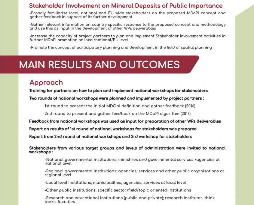 WP5: Stakeholder involvement on mineral deposits of public importance – Finally, the always important involvement with different stakeholders was achieved by WP5. Here, the partners held national consultation workshops to get information and opinions from relevant stakeholders (Environmentalists, Governments) in the application of the MDoPI framework.
