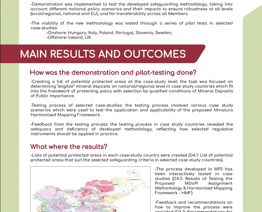 WP3: Regulatory framework – The objective of WP3 was to define the possibilities to incorporate the concept of MDoPI established previously, into the regional, national and EU levels of minerals land use planning. The idea was to explore and establish regional, national and EU-level regulatory criteria for the safeguarding of MDoPI at different levels.