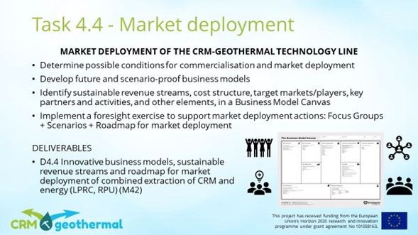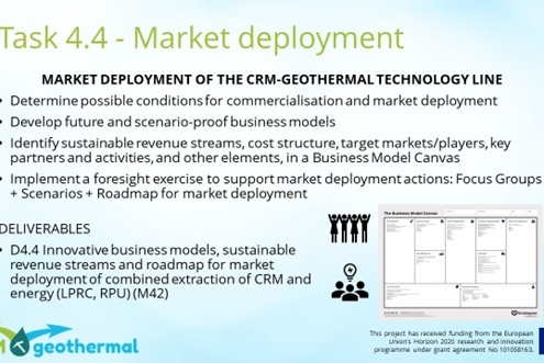 Task 4.4 – Market Deployment. This task is from Work Package 4 – Deployment of the combined extraction of CRM and energy from geothermal fluids, led by INTRAW. The objective is to develop a roadmap for the potential upscaling and commercialization of the technology involved in the extraction of CRM (Critical Raw Materials) from the brine in geothermal wells.