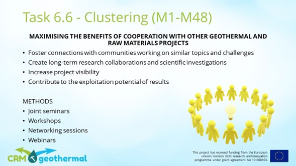 Task 6.6 – Clustering. This task is from Work Package 6 – Dissemination, communication and exploitation, led by EFG. The objective is to foster connections with communities working on similar topics and challenges; create long-term research collaborations and scientific investigations; increase project visibility; and contribute to the exploitation potential of results.