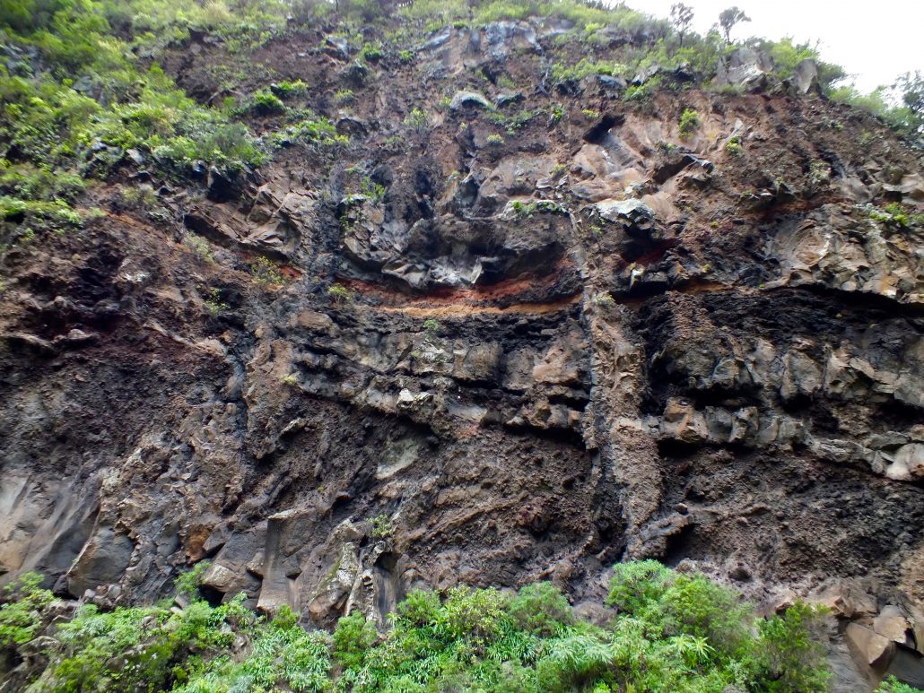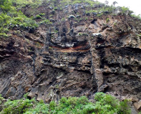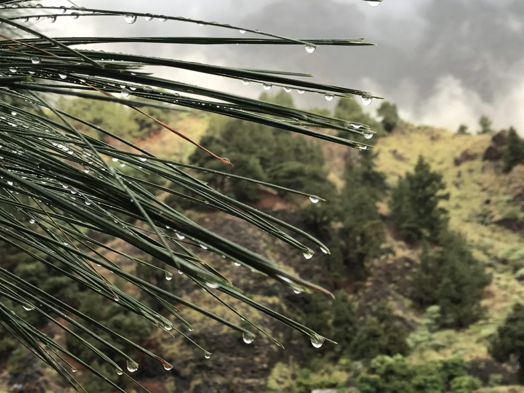 The Canary Islands host many natural phenomena. One of them is a significant part of the hydrogeological system which provides drinking water for the islands’ inhabitants and irrigation for the land. The annual precipitation in La Palma can vary between 300 and 1400 mm (MC Cabrera) depending on the altitude. However, a significant source of groundwater comes from “horizontal rain,” a process which involves Canary pine trees (Pinus canariensis), low altitude clouds, porous tuff and impermeable dykes. When humid air from the ocean moves over the volcanic mountains of La Palma, it is forced to ascend to a higher altitude by the topography of the island. As it cools and its pressure decreases, at a certain height water precipitates and cloud is formed. Since the air is ascending along the mountain, the clouds are often formed at ground level and flow though the Canary pine tree forests as they continue to rise. The type of pine tree endemic to the island typically has needles as long as 15 cm long. Water droplets are captured on these needles from the rising clouds, fall onto the ground and enter to the subsurface. A volcanic island, La Palma is not lacking in layers of porous tuff and igneous dykes. Water can easily flow through these tuff layers and collect in reservoirs, which are then trapped and sealed by impermeable dykes. These water bodies can be accessed and drained by horizontal tunnels, or water mines, as the locals call them.