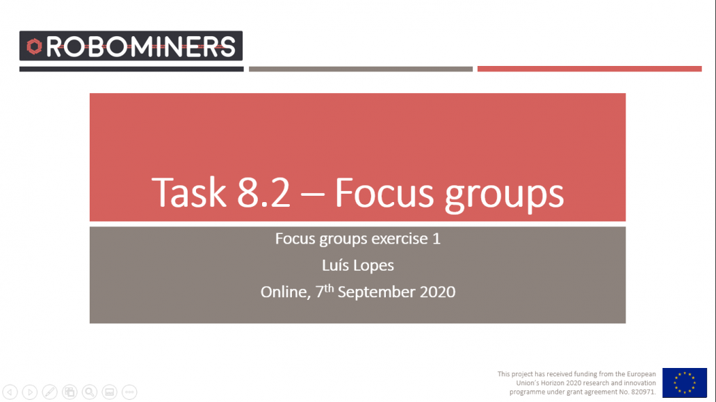 For the purpose of this meeting, LPRC was responsible to present the status of WP8 – Active clustering and roadmapping. Until now, the team has been working towards clustering with other projects and initiatives with the aim to share knowledge on robotics and raw materials topics alike. After the WP status introductions, LPRC also prepared and hosted a Focus Group exercise with some of the project partners where relevant ROBOMINERS topics were explored and discussed.