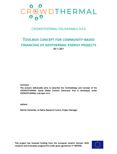 The deliverable “D4.4: Toolbox concept for community-based financing of geothermal energy projects” was developed by LPRC – La Palma Research Centre, and it presents the methodology and concept around the creation of the CROWDTHERMAL social media content generator. It is embedded in the CROWDTHERMAL website to facilitate the dissemination of the Core Services. The related work and reporting are part of the task 4.4 and subtask 4.4.6 “Social media content generator”.