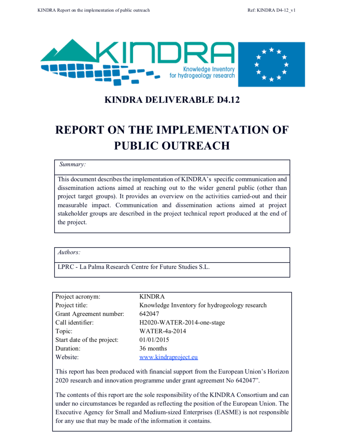 This document describes the implementation of KINDRA’s specific communication and dissemination actions aimed at reaching out to the wider general public (other than project target groups). It provides an overview on the activities carried-out and their measurable impact. Communication and dissemination actions aimed at project stakeholder groups are described in the project technical report produced at the end of the project.