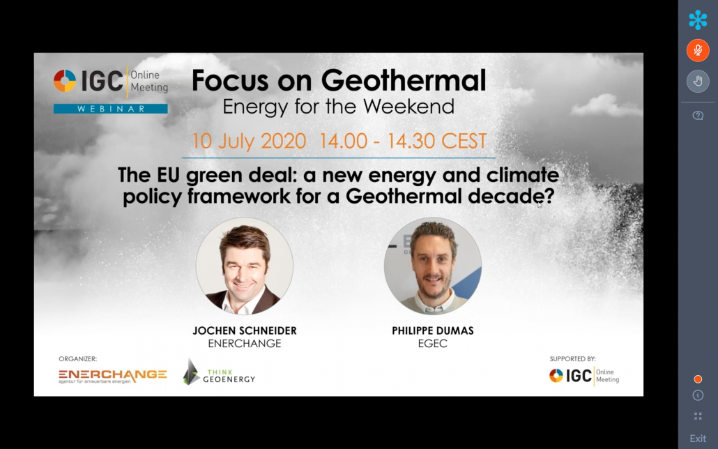 On 10 July 2020, EGEC hosted an IGN online meeting on geothermal energy’s place in the new EU Green Deal Framework. The discussion was mainly centered around the idea that the new decade will be a Geothermal Decade. To back up this claim, Philip Dumas (EGEC’s Secretary) first exposed the growing relevance of geothermal in the current EU energy market. The push toward climate neutrality by 2050 together with an increasing number of renewable energy sources will call for smart management of the energy load and baseload energy to ensure constant levels of electricity throughout the day while fluctuating energy sources such as wind, hydro and solar can rapidly respond to a spike or a decrease in energy demand. According to experts, geothermal energy can serve as baseload energy sources as its energy output is constant throughout the day and available 24/7. In addition, geothermal energy can provide both heating and cooling which represent 64.4% of the energy consumption of an average EU household.